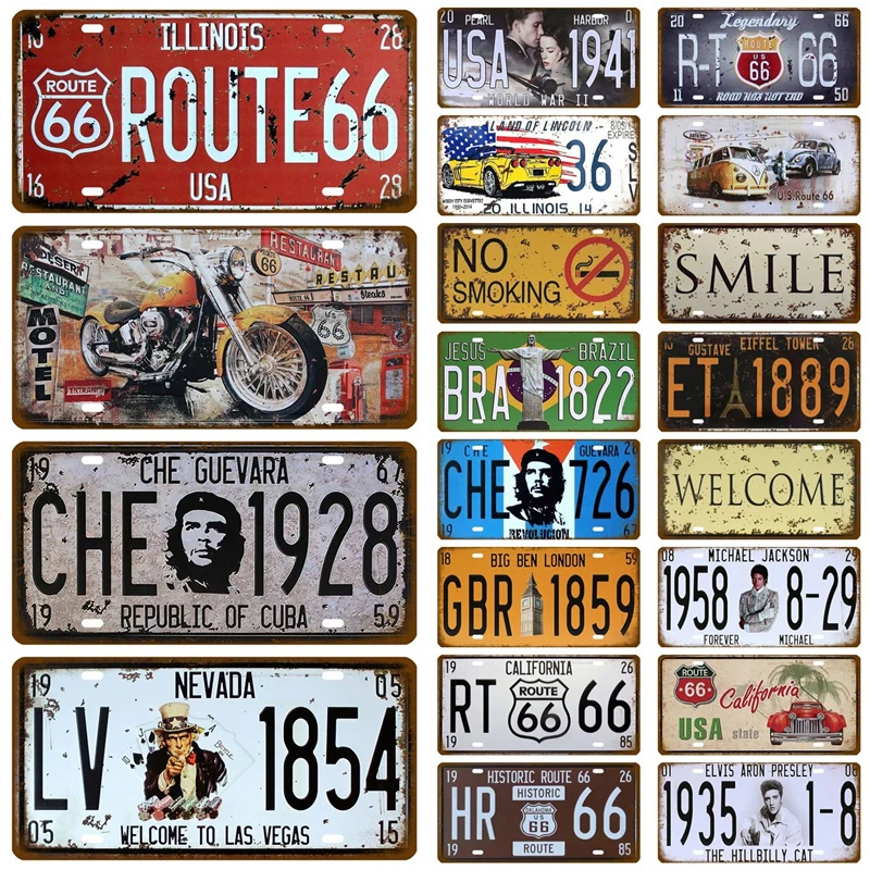 Route 66 Vintage Poster Car Number License Plate Plaque Poster Metal Tin Signs Bar Club Wall Art Garage Home Decoration 15*30cm
